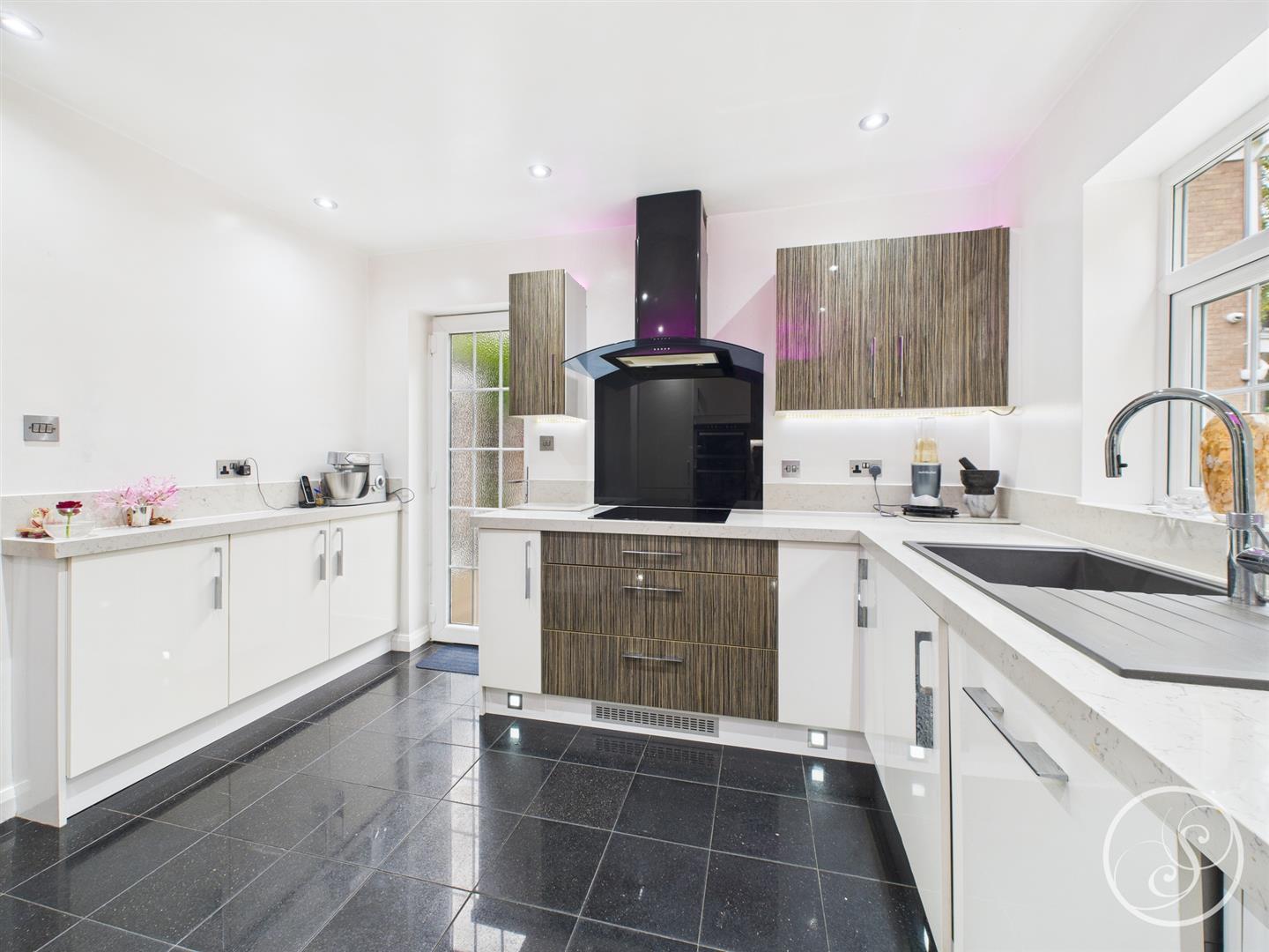 Kitchen - Modern kitchen is made up of wall and base units with integrated fridge/freezer, dishwasher, electric hob with extractor above and a double oven with plenty of storage space. Rear door leads out to the garden. The kitchen is conveniently placed opposite to the dining room for easy access when hosting.