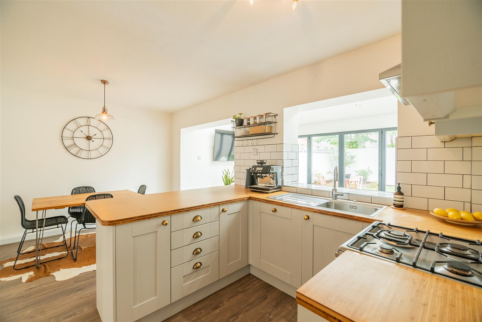 Kitchen/Diner - Open plan living space boasts a modern fitted kitchen made up of shaker style wall and base units and comprises integrated dishwasher and freestanding oven with gas hob and extractor above. There is an abundance of storage space, breakfast bar seating and the kitchen is complete with wood worktops. The kitchen is open to the dining area and also leads through to the second living room. Access is also offered from the kitchen to the utility room, w/c and integral garage.