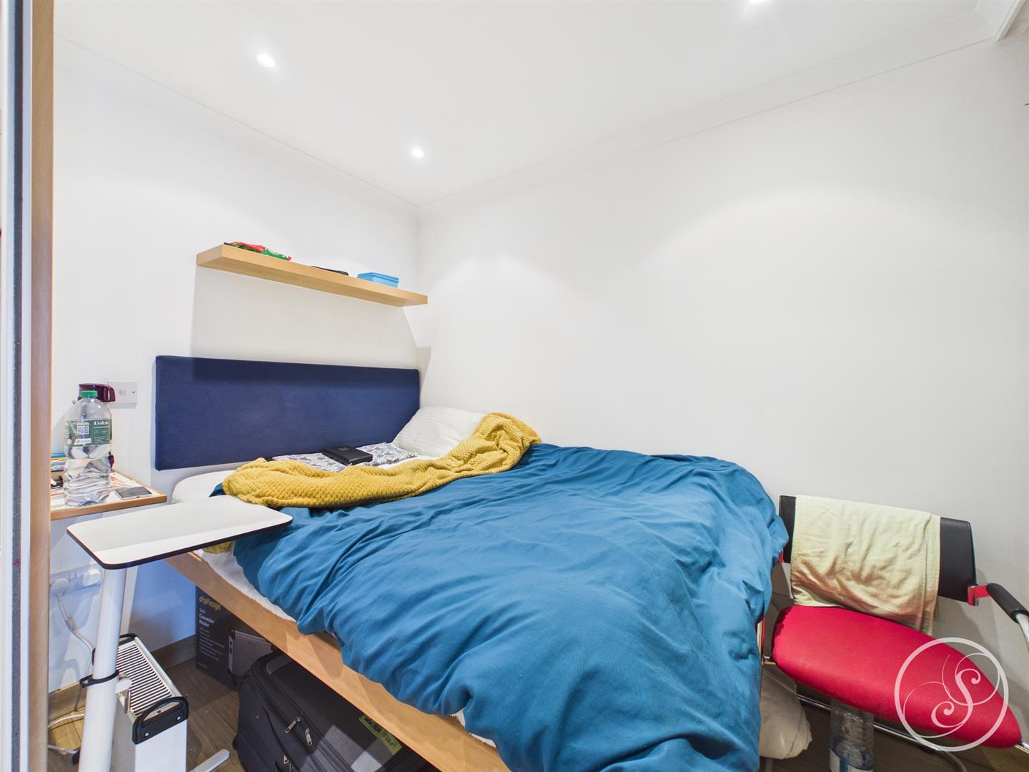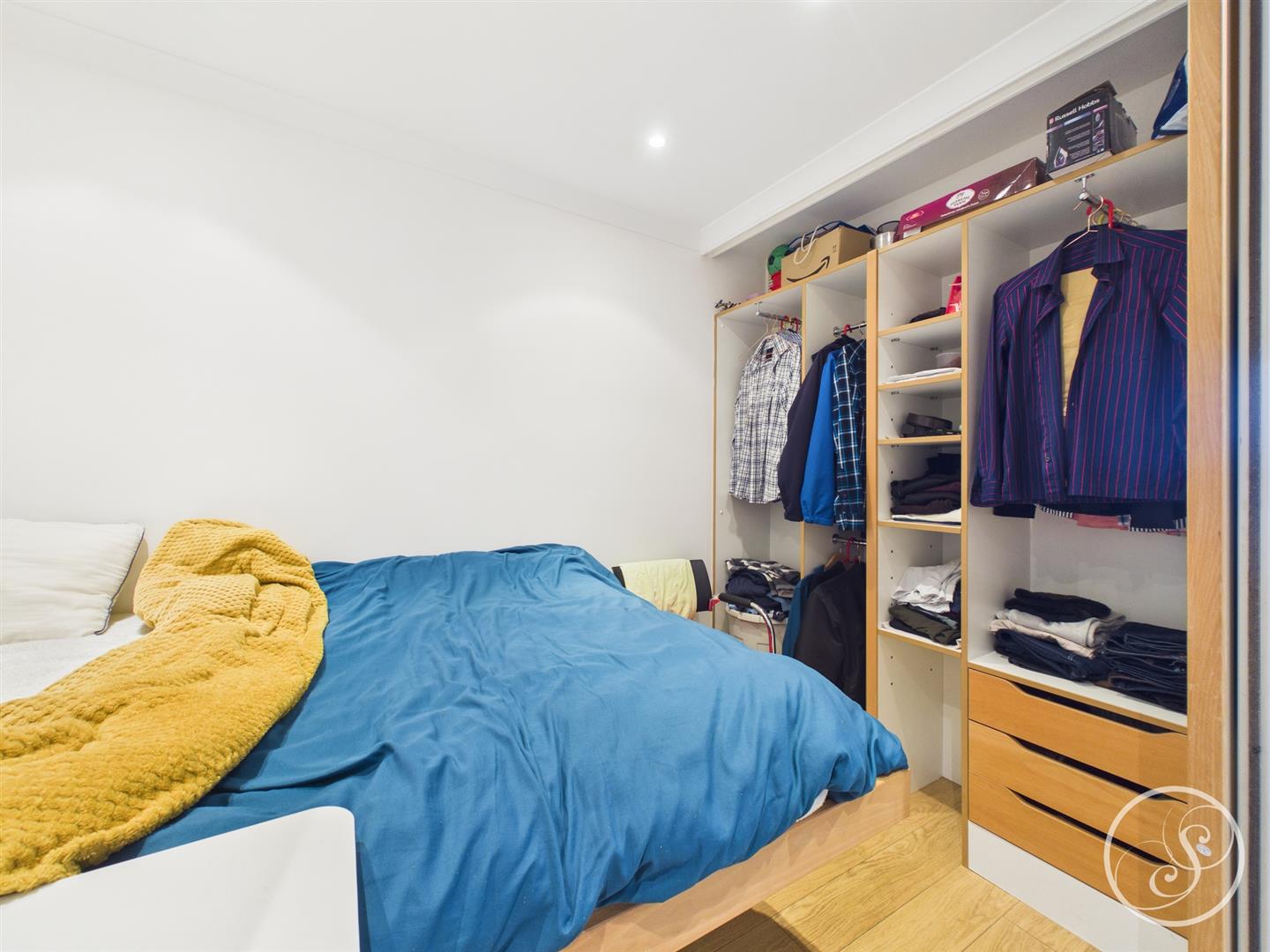 Bedroom - Wood strip laminate flooring, built in open wardrobe. Accommodates double bed.