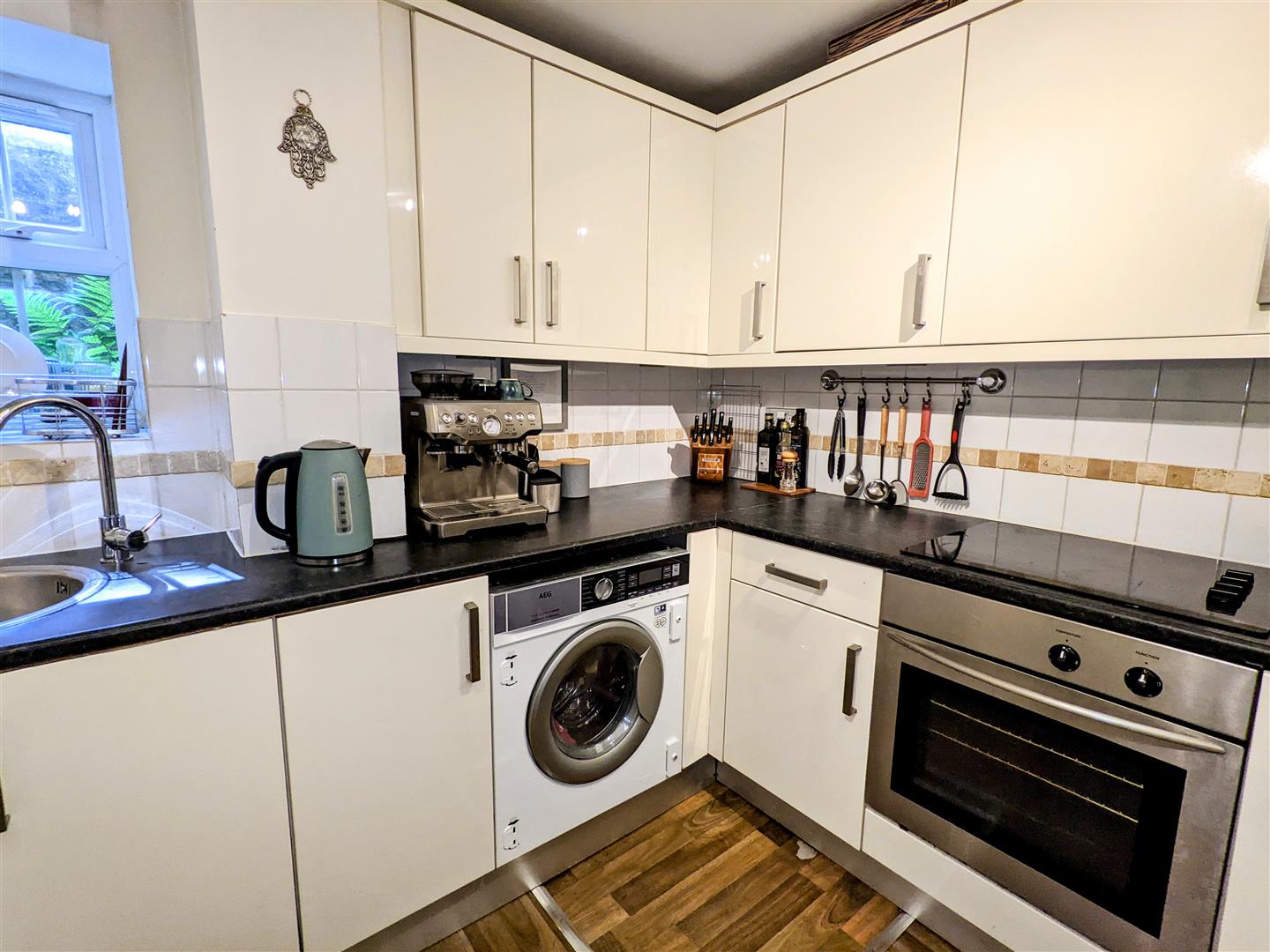 Kitchen - The fitted kitchen comprises wall and base units and includes an integrated oven and electric hob, as well as a washer/dryer. There is also space for a freestanding fridge/freezer.