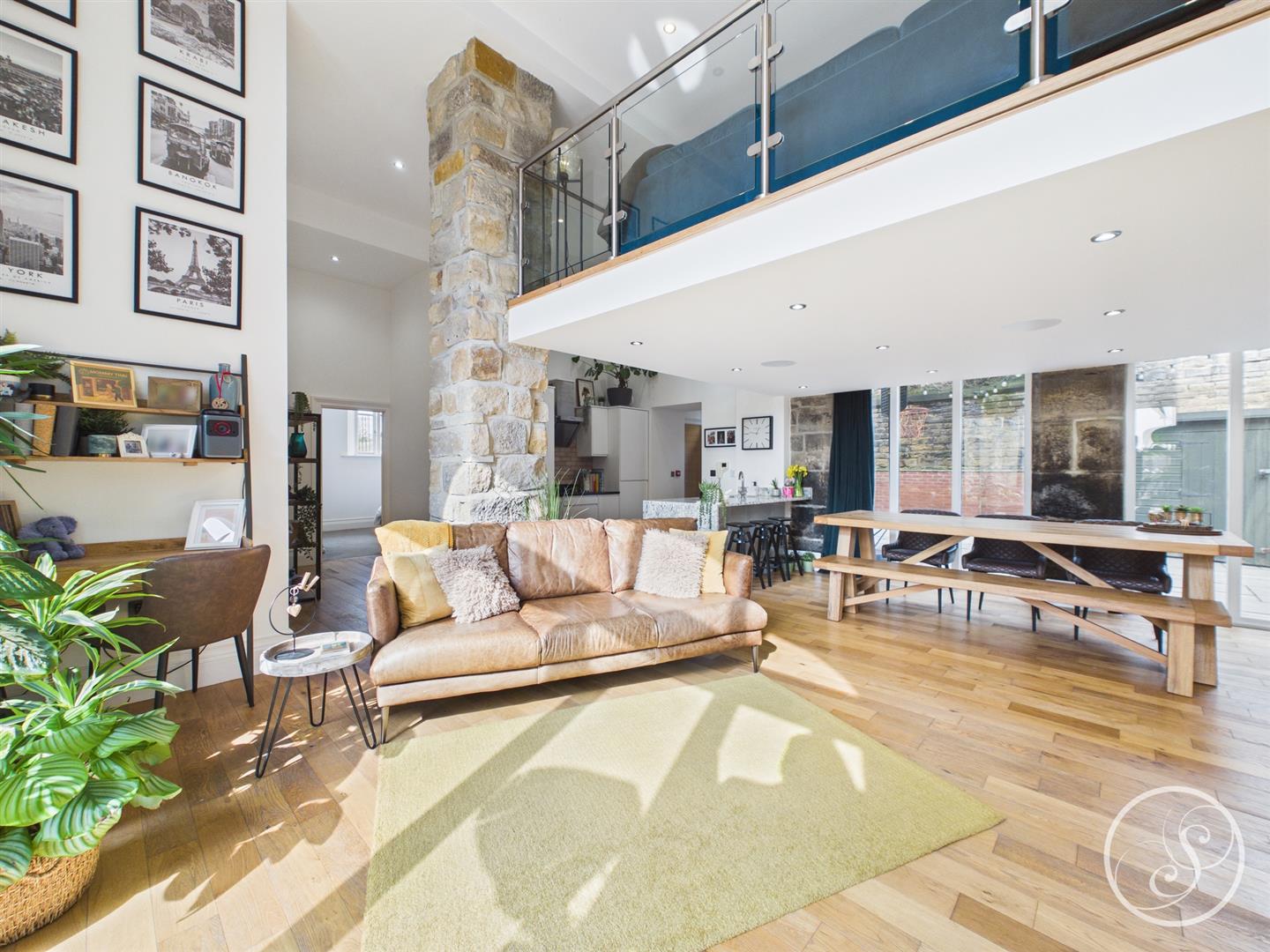 Open Plan Living / Dining - Large open plan living / dining area with solid oak flooring, floor to ceiling double glazed windows to the dining side with bi-folding doors to the other leading straight out to the amazing private terrace. The room benefits from three wall mounted electric heaters and has stairs leading to the mezzanine level with under stairs cupboard.