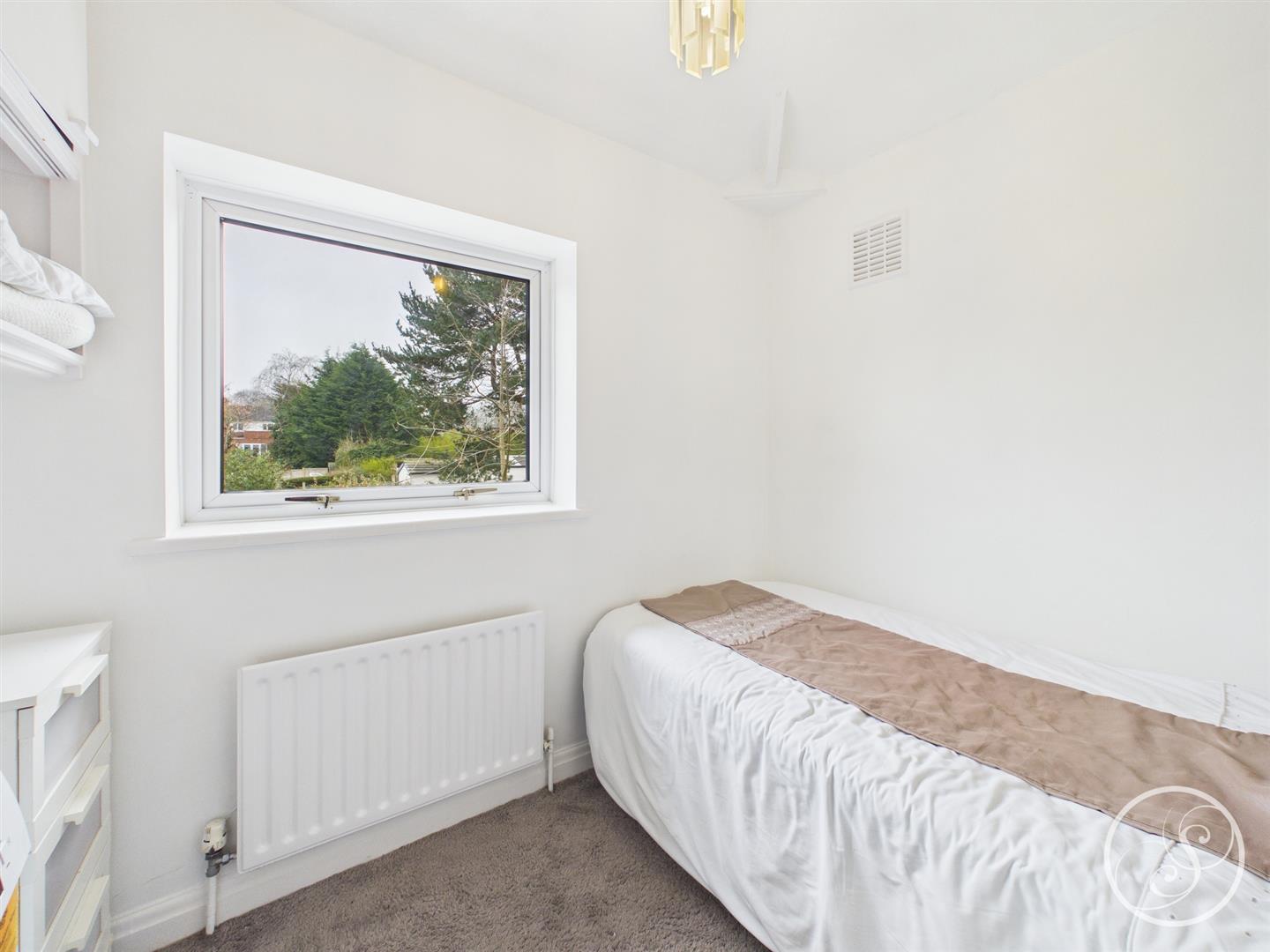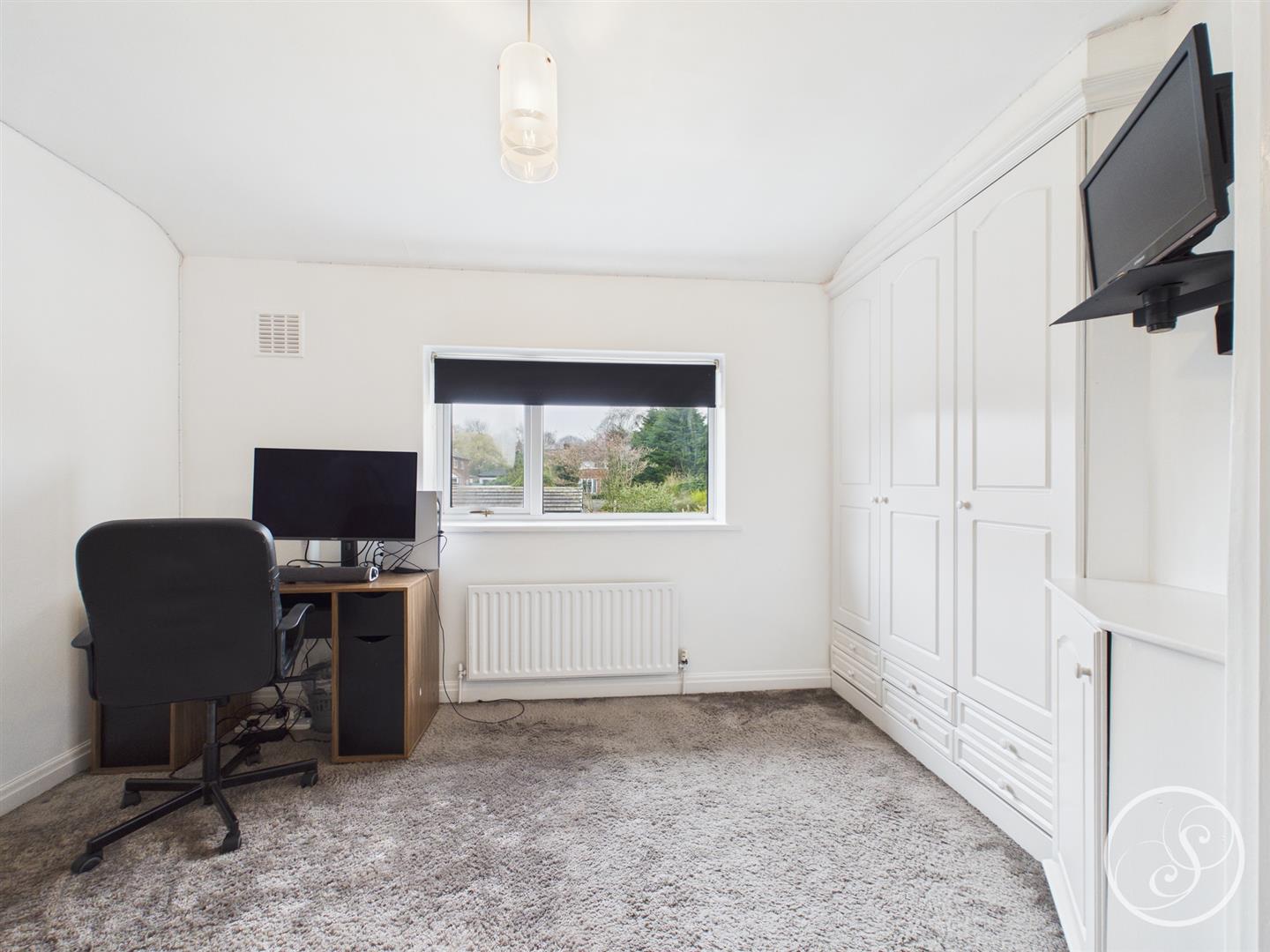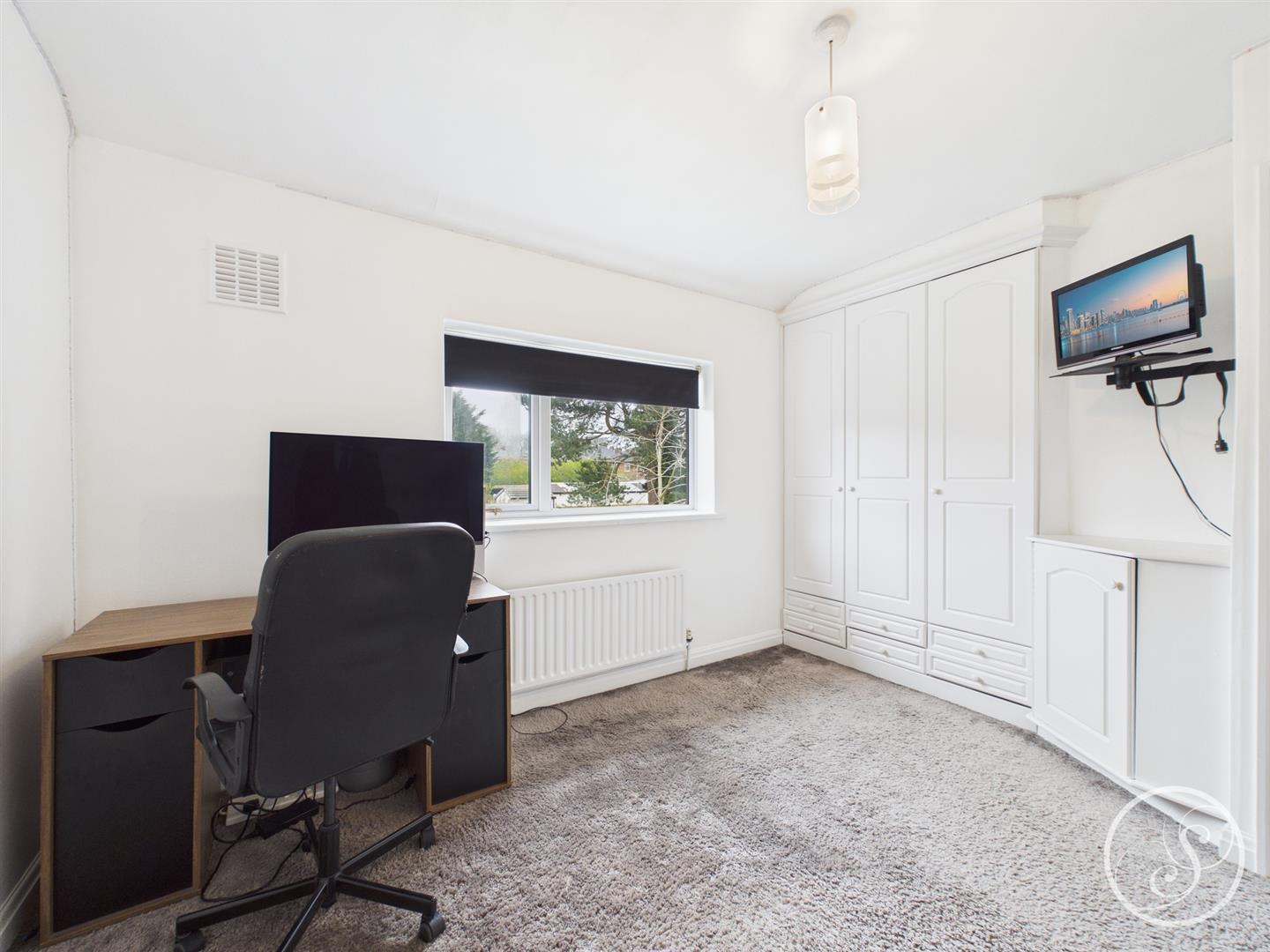 Bedroom Three - A single bedroom laid to carpet, featuring a central heating radiator, a large window, and a shelving unit for additional storage. Also ideal for a home office.