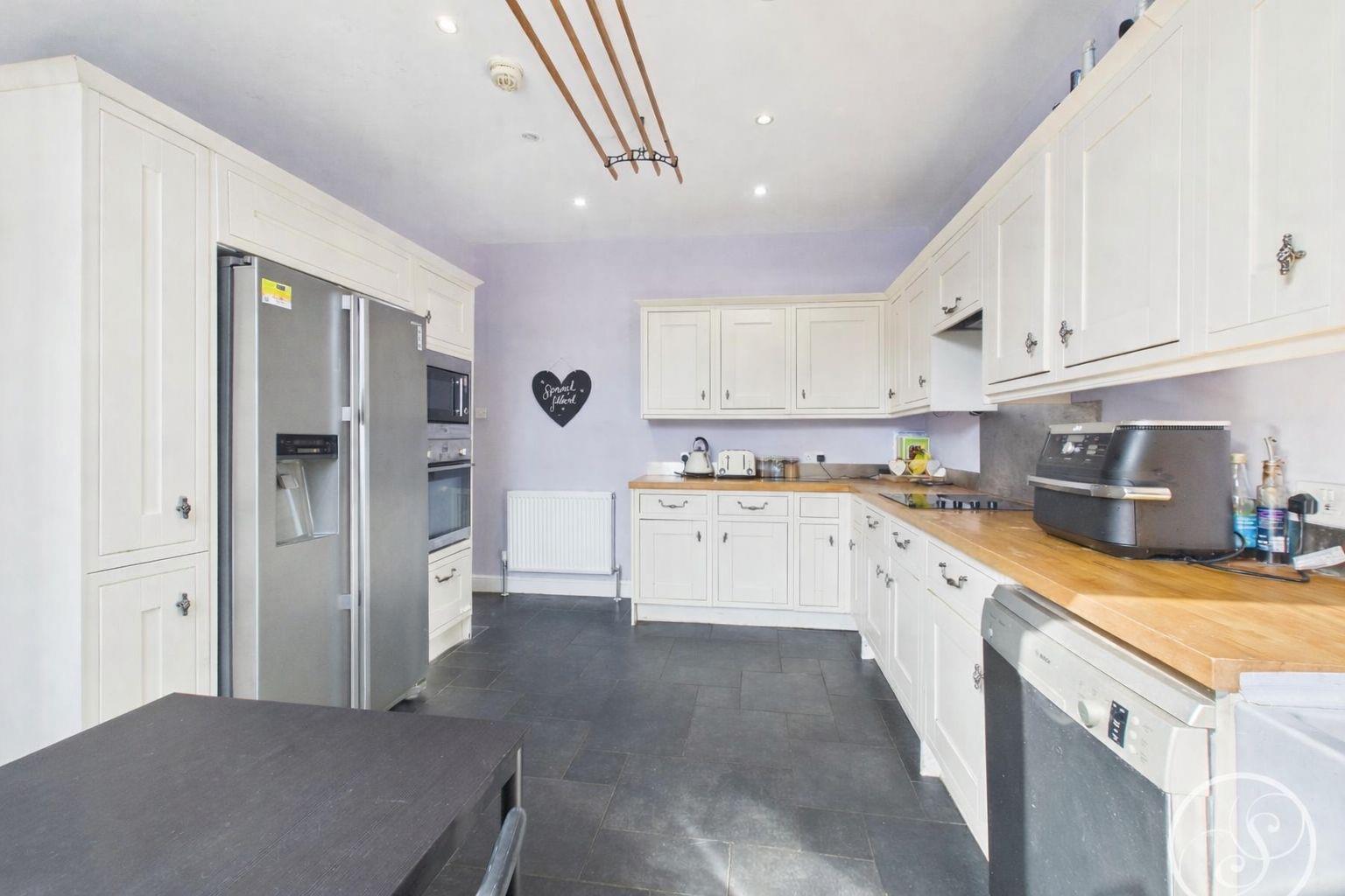 Kitchen/Diner - Spacious open plan kitchen/diner offers ample space for formal dining and the fitted kitchen is made up of shaker style wall and base units and includes integrated microwave, oven, with space for American style fridge/freezer, and dishwasher. The kitchen boasts a huge amount of storage space and door leads down to the basement, and another door leads to the back door which leads out to the garden.