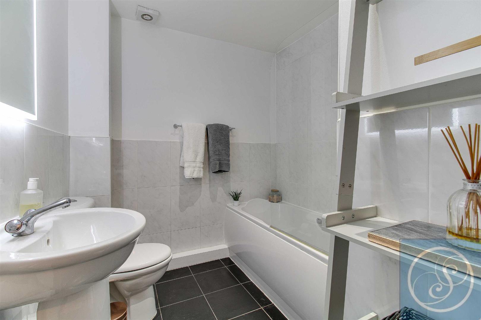 Bathroom - Modern white suite comprising bath with shower over and screen, low level W.C., pedestal wash hand basin, part tiled walls, tiled floor, radiator, extractor fan.