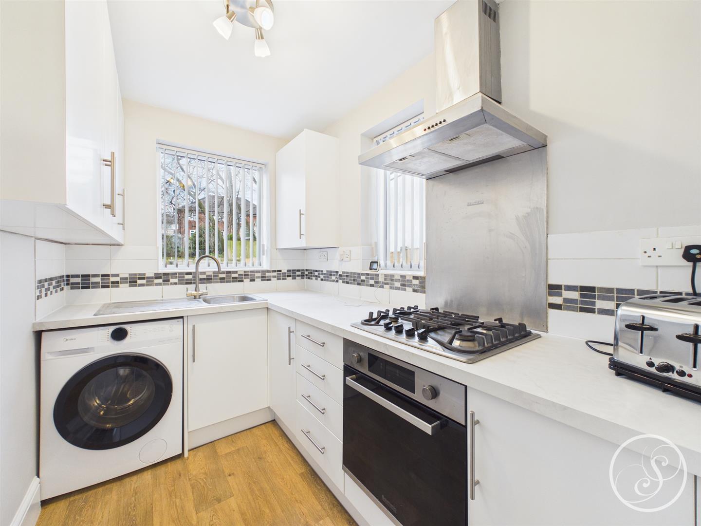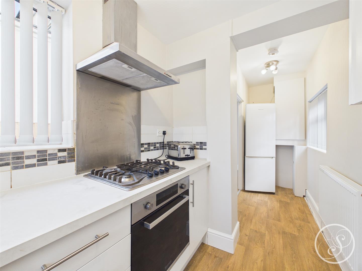 Kitchen - Modern fitted kitchen made up of wall and base units, complete with oven, gas hob and extractor.