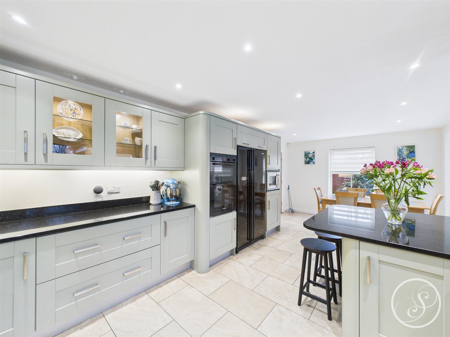 Kitchen/Diner - Fitted with a range of modern kitchen units with granite worksurfaces incorporating a double sink. Five burner gas hob with cooker hood above. Double oven. Built in microwave. Space for American style fridge/freezer. Space for dining table. Open plan into sitting/sun room.