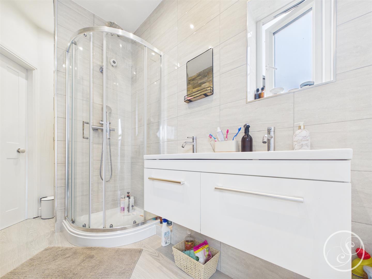 Jack And Jill Bathroom - Shower cubicle. Low flush w.c. Wash hand basin with storage below. Heated towel rail.