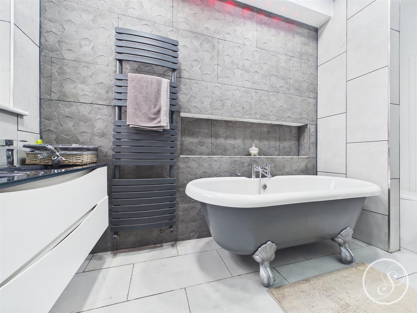 Ensuite - Double glazed frosted window to front elevation. Free standing bath. His and hers sink. Low flush w.c. Heated towel rail.