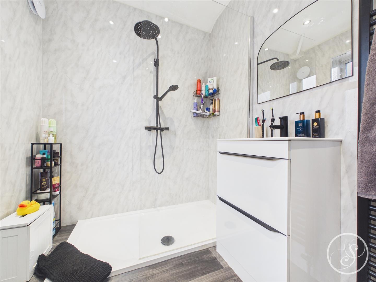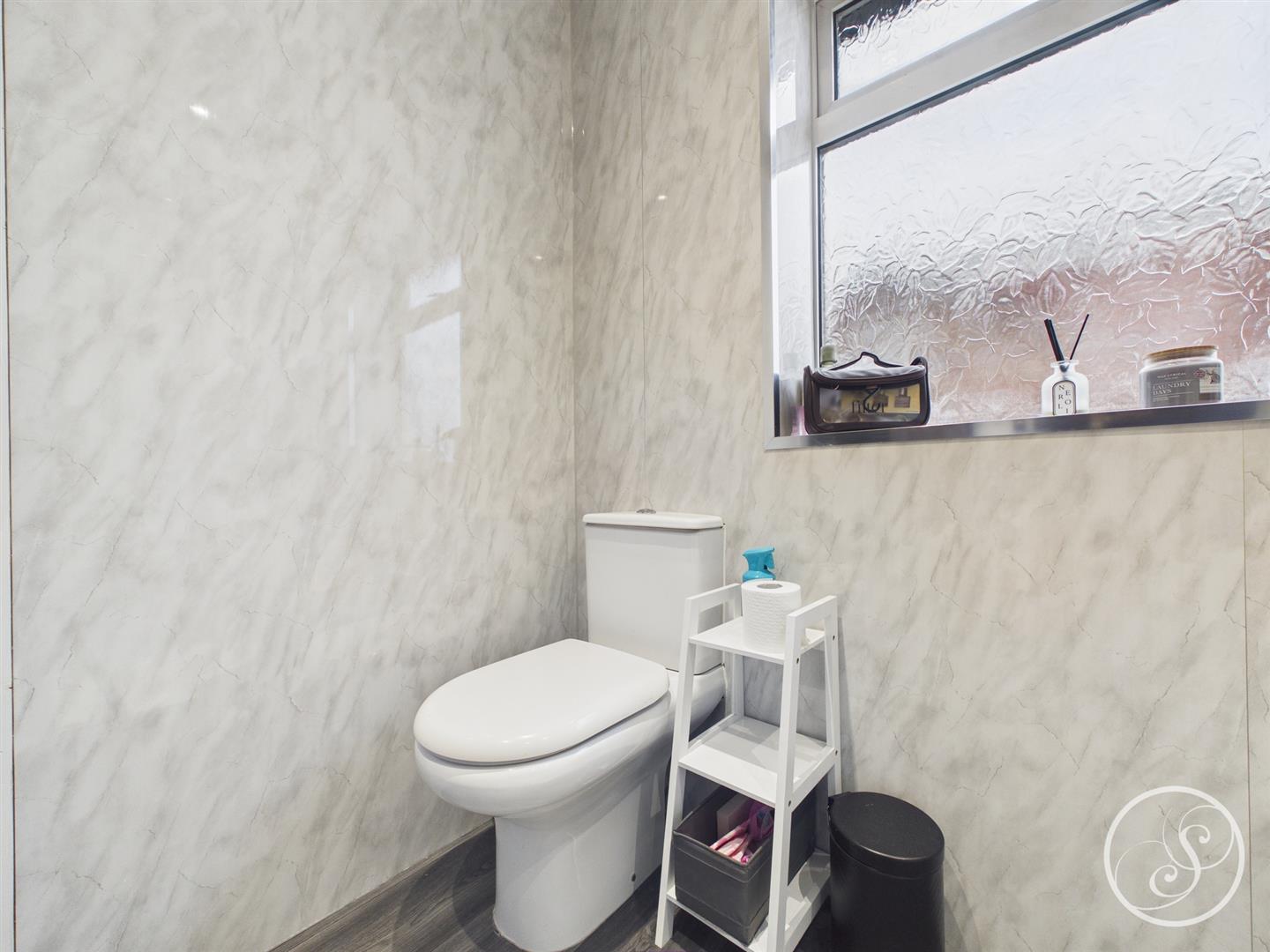 Bathroom - Double glazed frosted window to the side elevation. Low flush w.c. Wash hand basin with storage below. Heated towel rail.