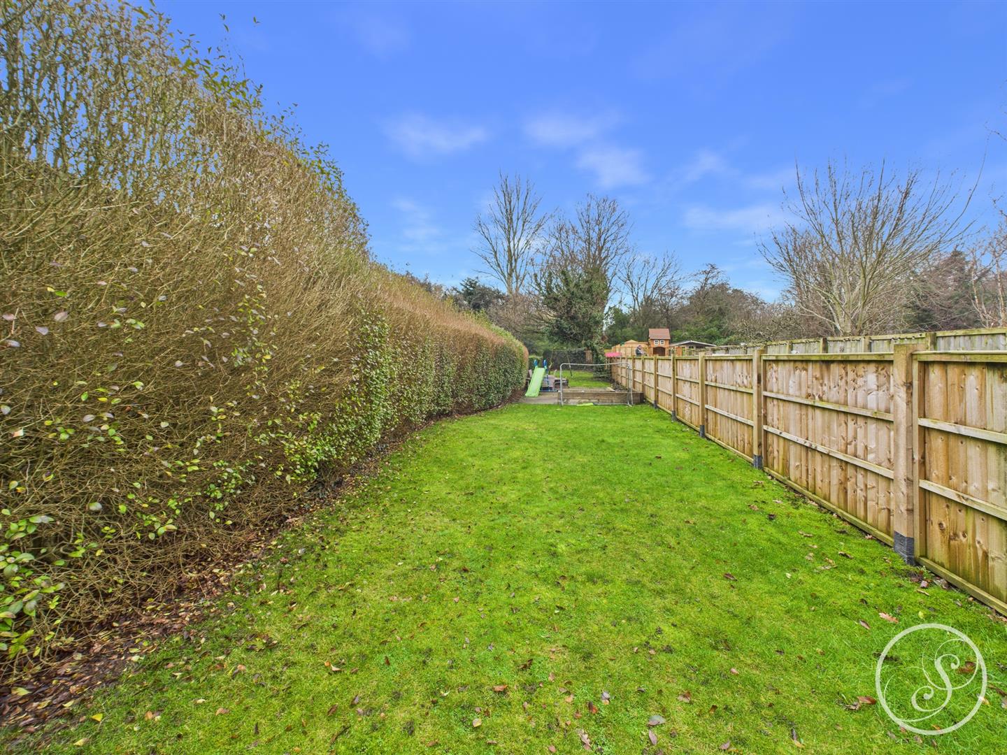 External - Garage with additional parking space in front. Front and rear garden with patio area. Additional extra large garden with grass laid to lawn to the front elevation.