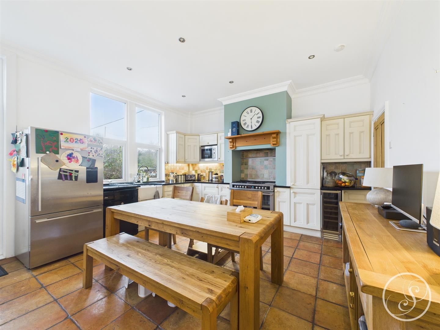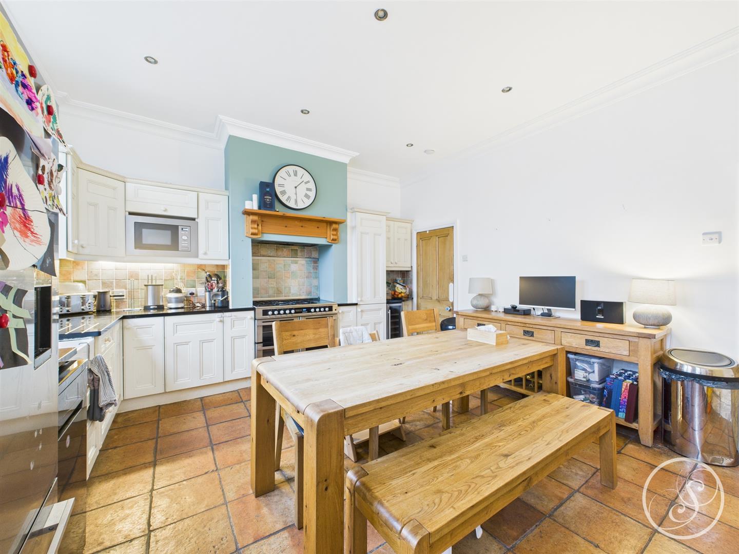 Kitchen/Diner - Double glazed window to the front elevation. Range of shaker style wall and base units. Belfast style sink and marble drainer. Integrated wine fridge. Range cooker. Dishwasher. Integrated microwave. Door leading to basement. Central heating radiator. Space for dining table. Terracotta tiled floor.