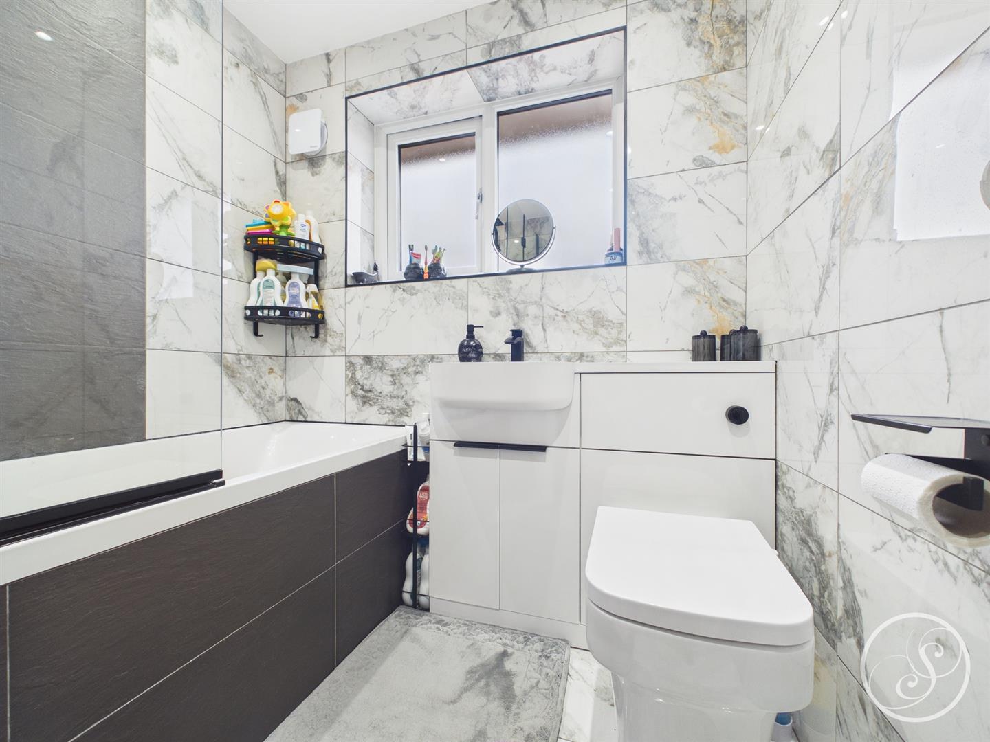 Bathroom - Double glazed frosed window to the rear elevation. Low flush w.c. Wash hand basin. Bath with shower above. Heated towel rail.