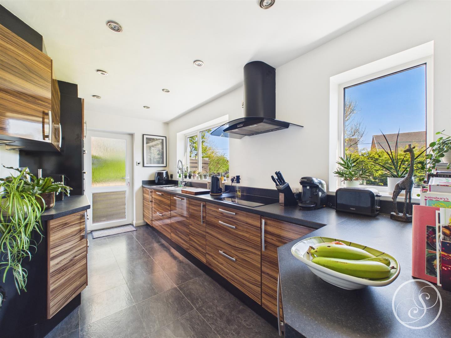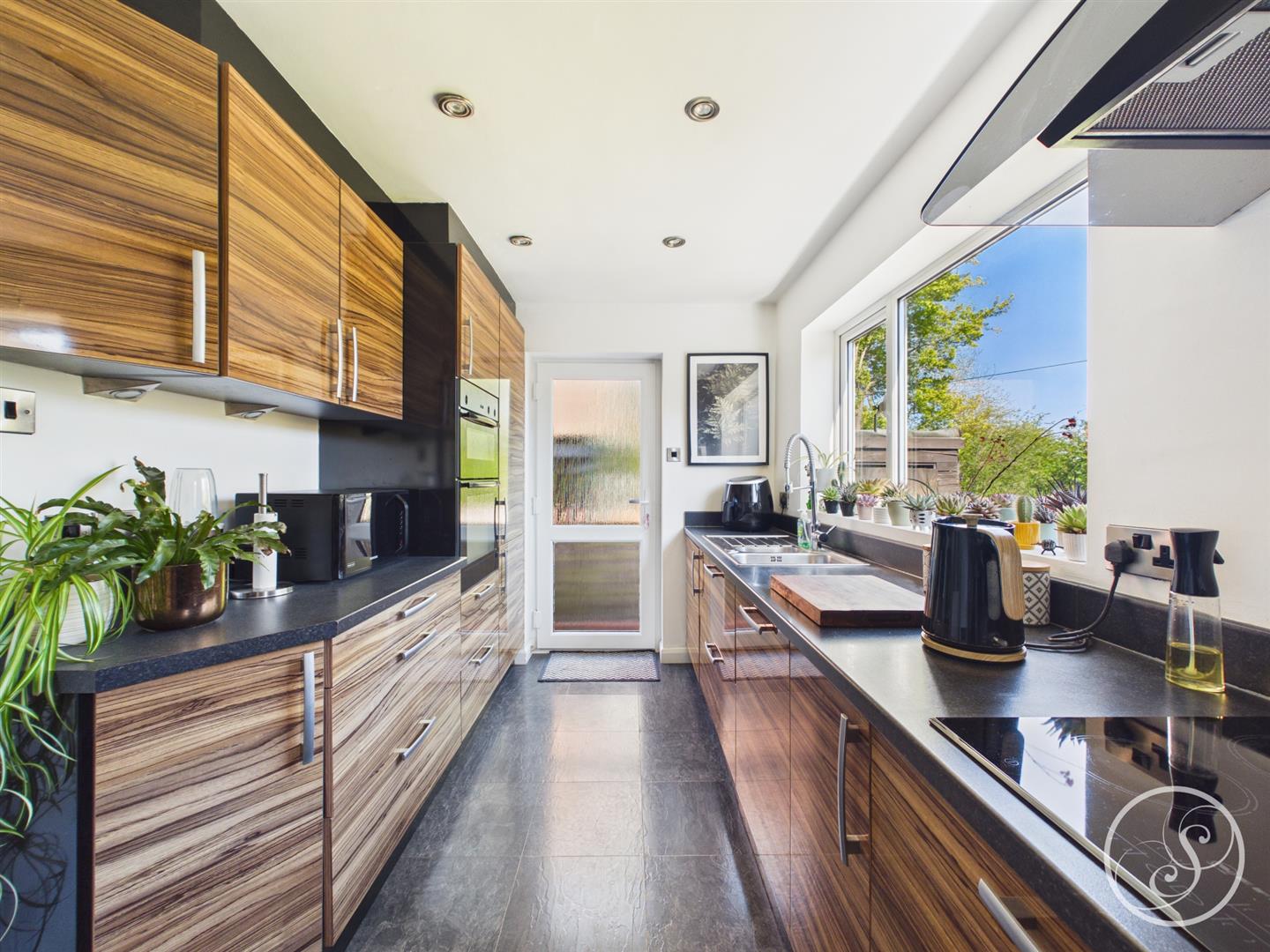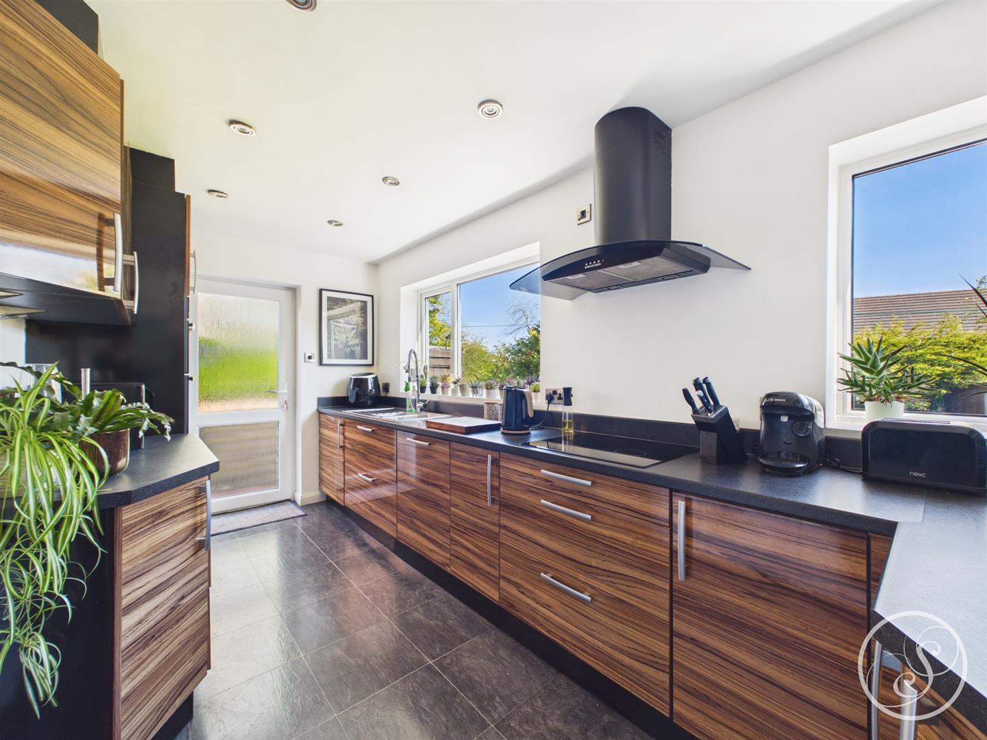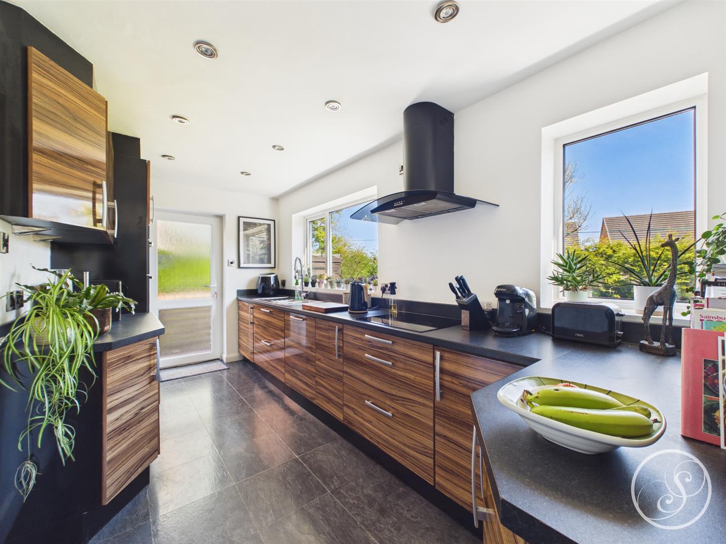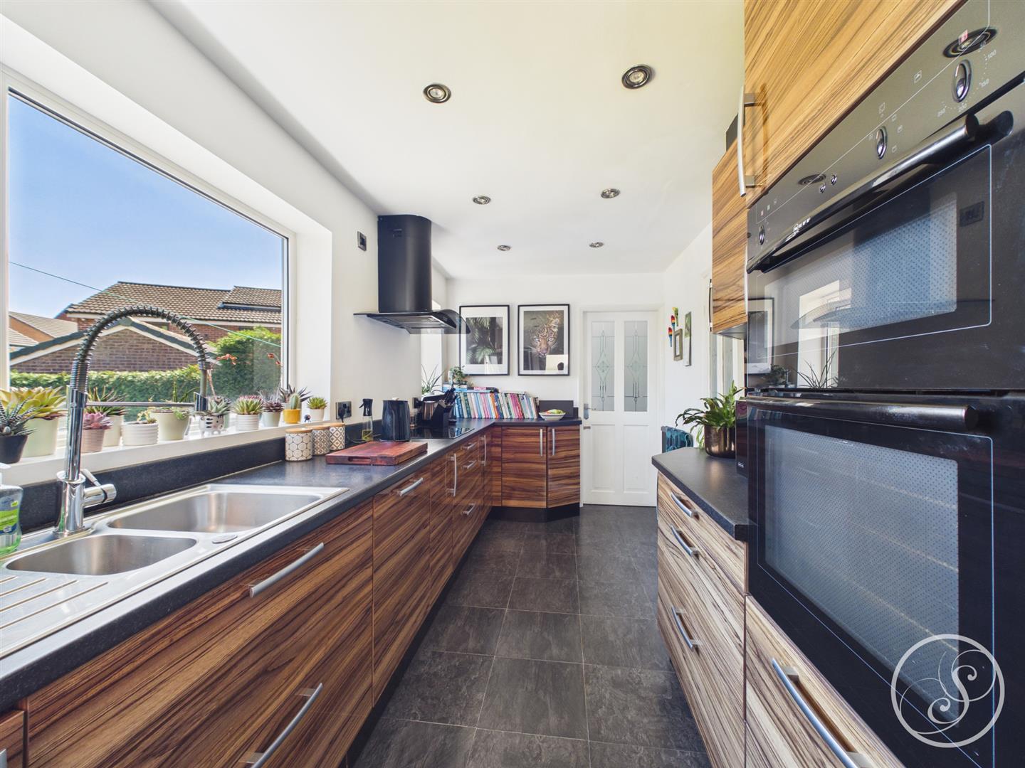Kitchen - Fitted with a large range of wall and base units with work surfaces over incorporating a sink and drainer unit. Double oven, hob with extractor fan over. Integrated fridge/freezer, washing machine and dish washer. External door to side. Double glazed window overlooking the garden.