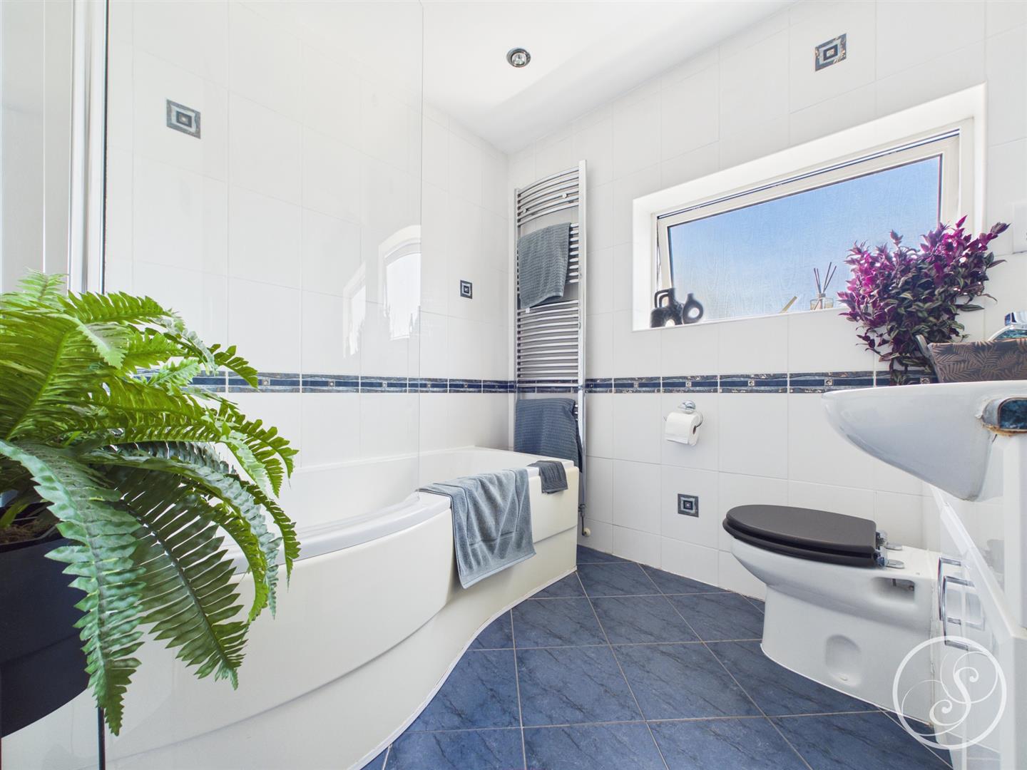 Bathroom - Fitted with a white suite comprising bath with shower over, vanity wash hand basin and wc. In addition there is tiling, heated towel rail and a double glazed window to the rear.