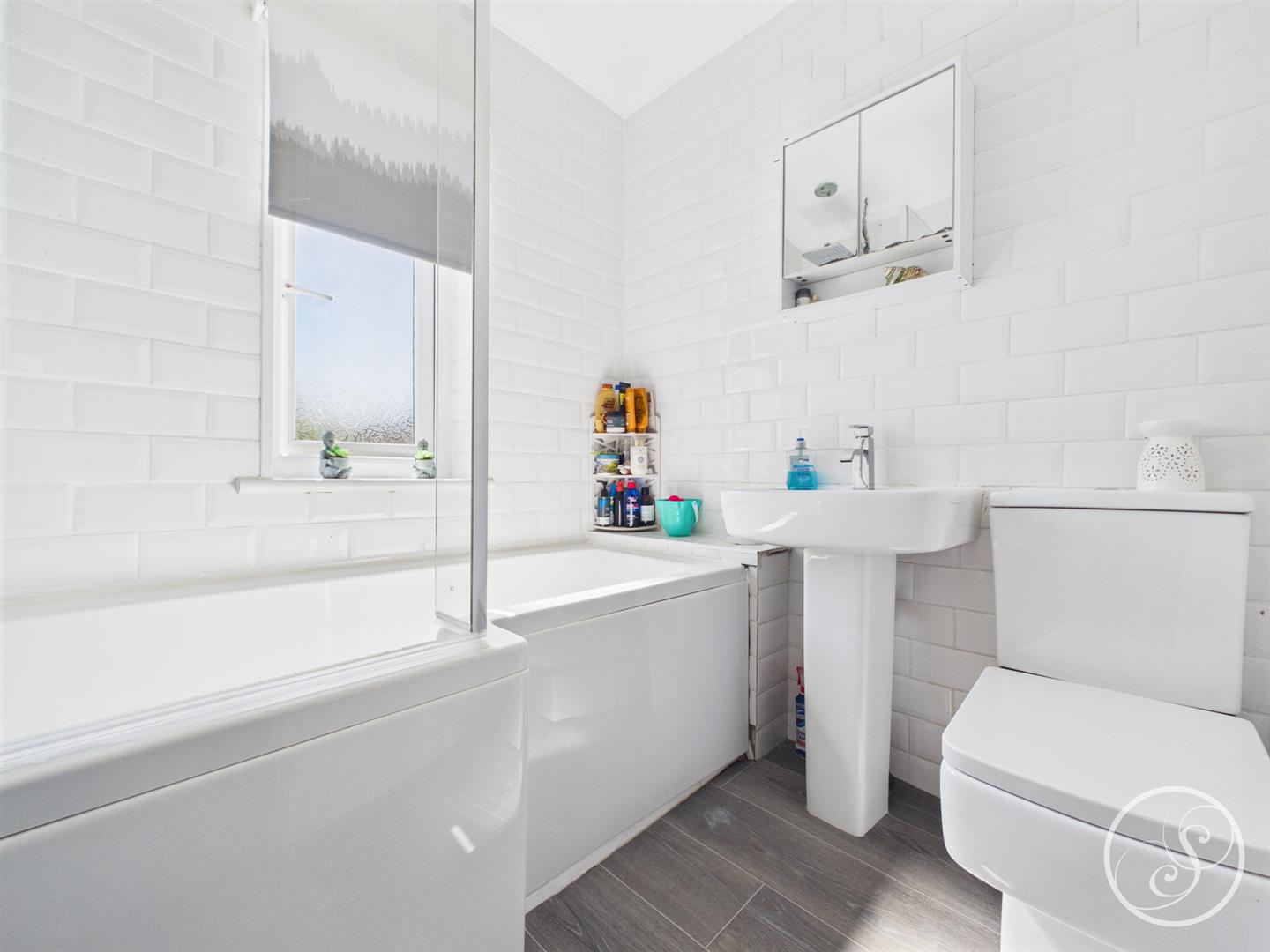 Bathroom - Fitted with a modern white suite comprising bath with shower over, wash hand basin and wc. In addition there is tiling a double glazed window and a heated towel rail.